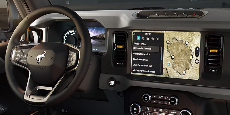 Once you enter the 2021 Ford Bronco, you're surrounded by luxury. The vehicle comes standard with cloth upholstery, but you can upgrade to receive vinyl or leather. For technology, even the base trim comes with an abundance of features including the SYNC 4 system connected to an 8.0-inch touch-screen display along with Apple CarPlay and Android Auto connectivity. Moving up a few trims, you gain a 12.0-inch touch-screen display and premium audio. It also includes a rack built into the dashboard, and you can mount your smartphone or GoPro there.